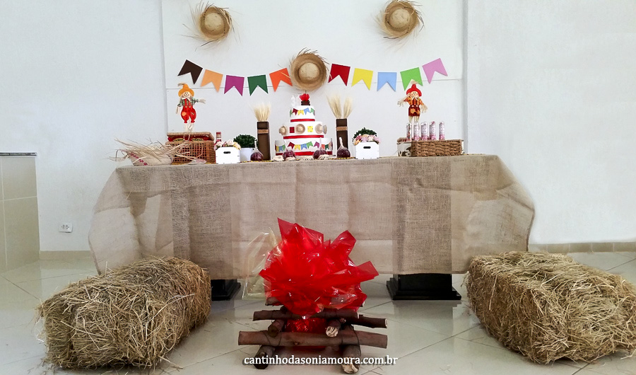 Para a mesa, usei toalha de juta e fiz um caminho de mesa de chita com tema bandeirinhas, para decorar, usei maçãs do amor, paçocas, pés de moleque, pipocas e docinhos nos mini chapéus de palha.